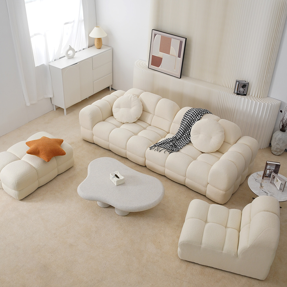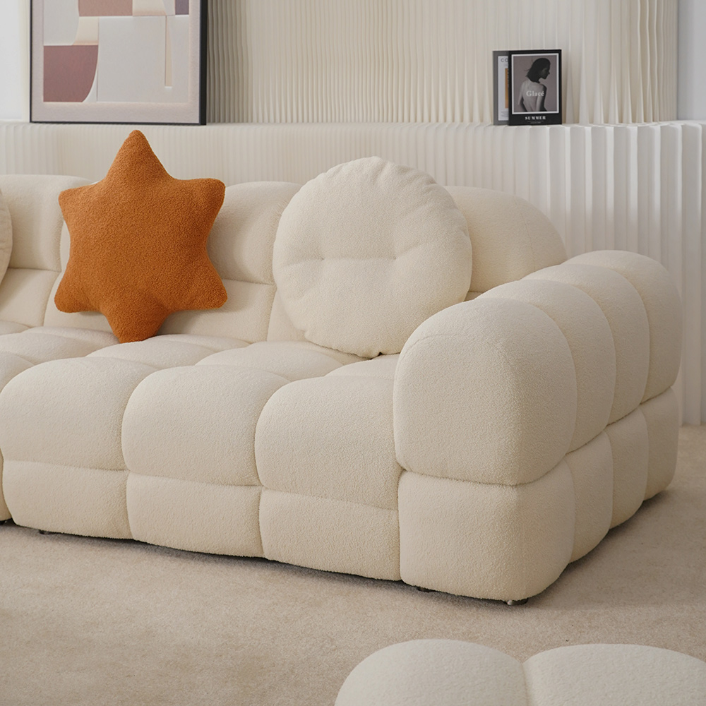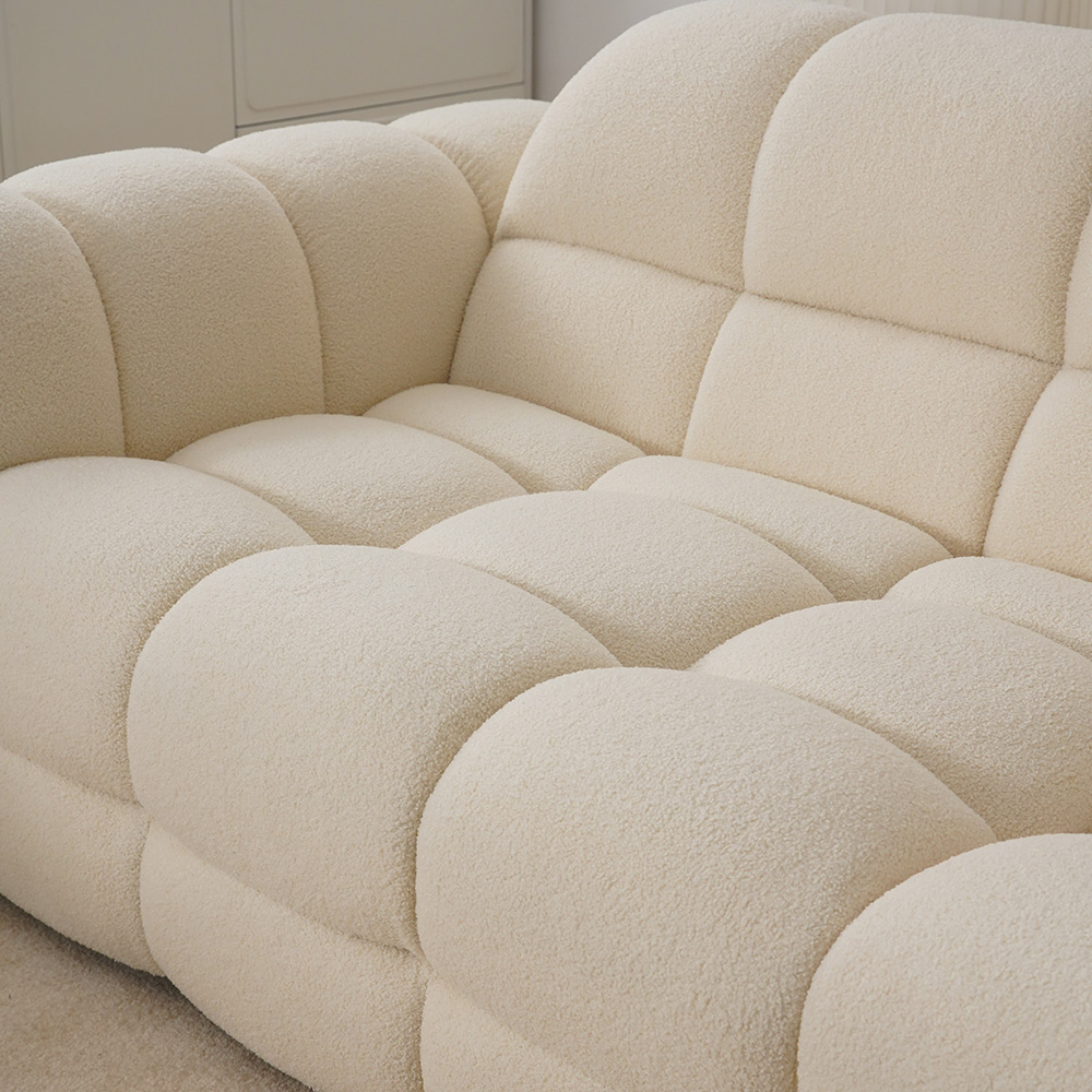 Dieses weiße Sofa wurde sorgfältig aus den besten Materialien gefertigt und steht für Eleganz und Langlebigkeit.Sein Marken-Teddy-Samtstoff, der an eine üppige Wiese erinnert, sorgt für einen Hauch natürlicher Schönheit.Der stabile Trägerrahmen aus hochwertigem Lärchenholz sorgt für dauerhafte Zuverlässigkeit.